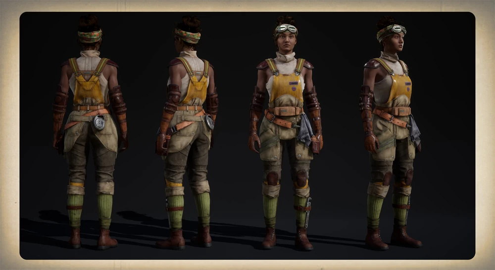 DESCRIPTION: "The oil stains tell you Parvati works hard, but the goggles tell you she values safety."